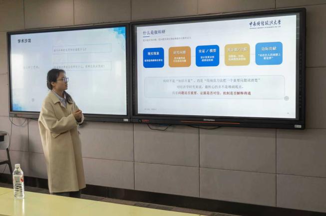 沙龙结束后,周婵博士带来科研能力提升专题分享。她系统阐释科研核心要义,梳理科研全流程方法,解析经济学领域前沿发展动态,详细介绍AI在科研各环节的应用场景,并就潜在风险作出提醒,引导同学们从基础训练入手,循序渐进夯实科研素养,稳步走好学术之路。