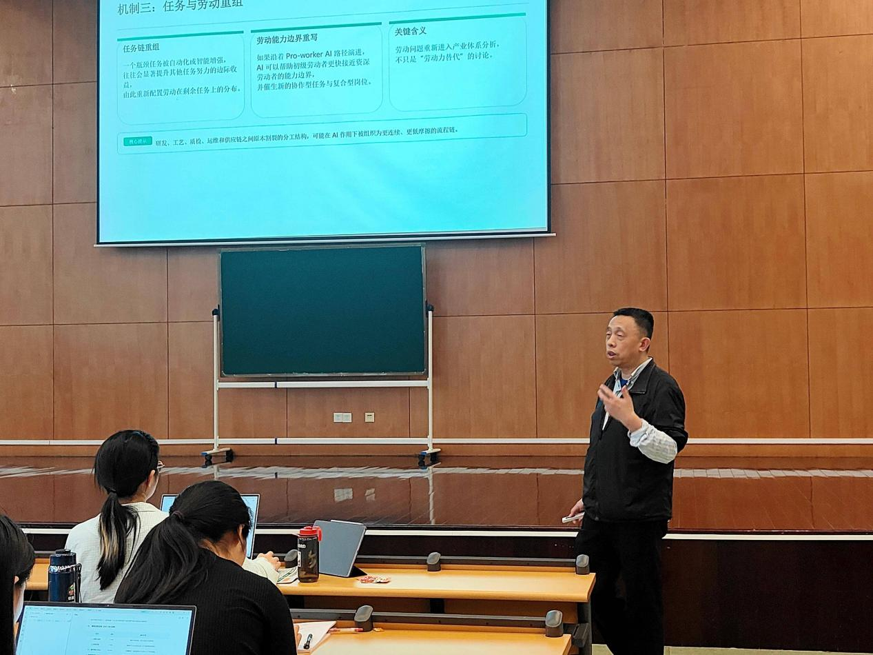 互动环节,龚强教授围绕AI产业应用、青年职业发展等问题与师生交流。他寄语青年学子,紧跟智能化产业发展浪潮,把握现代化产业体系建设机遇,将个人成长融入实体经济高质量发展大局,以青春之力助力国家产业升级与经济稳健发展。