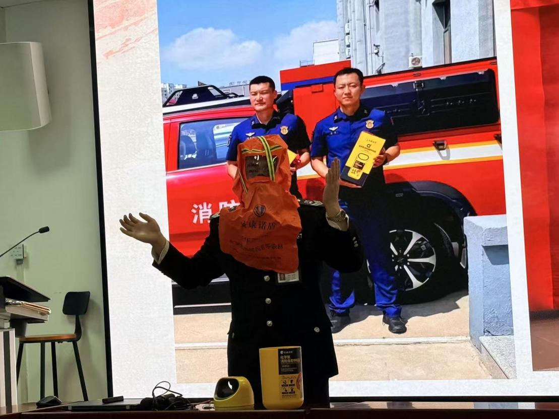 在实操教学环节,教官重点介绍了火灾逃生面罩等实用防火工具,并现场演示了工具的正确使用方法与操作规范,指导教职工掌握设备使用要点,确保大家在紧急情况下能够规范使用工具开展自救互救。